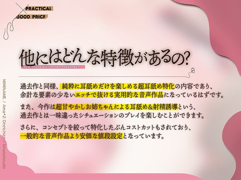 また、今作は超甘やかしお姉ちゃんによる耳舐め&射精誘導という、